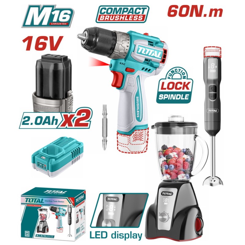 TOTAL ΣΕΤ ΔΡΑΠΑΝΟΚΑΤΣΑΒΙΔΟ 60Nm + BLENDER ΧΕΙΡΟΣ + BLENDER ΒΑΣΗΣ ΜΠΑΤ. Li-ion 16V / 2Ah / 2 ΜΠΑΤ (TOSLI240868E)