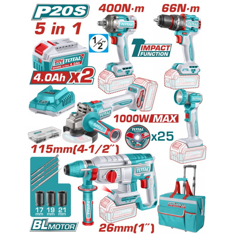 TOTAL ΕΠΑΓΓ. ΣΕΤ 5τεμ ΕΡΓΑΛΕΙΩΝ ΜΠΑΤ. Li-ion 20V / 4Ah / 2 ΜΠΑΤΑΡΙΕΣ (TCKLI20592E)