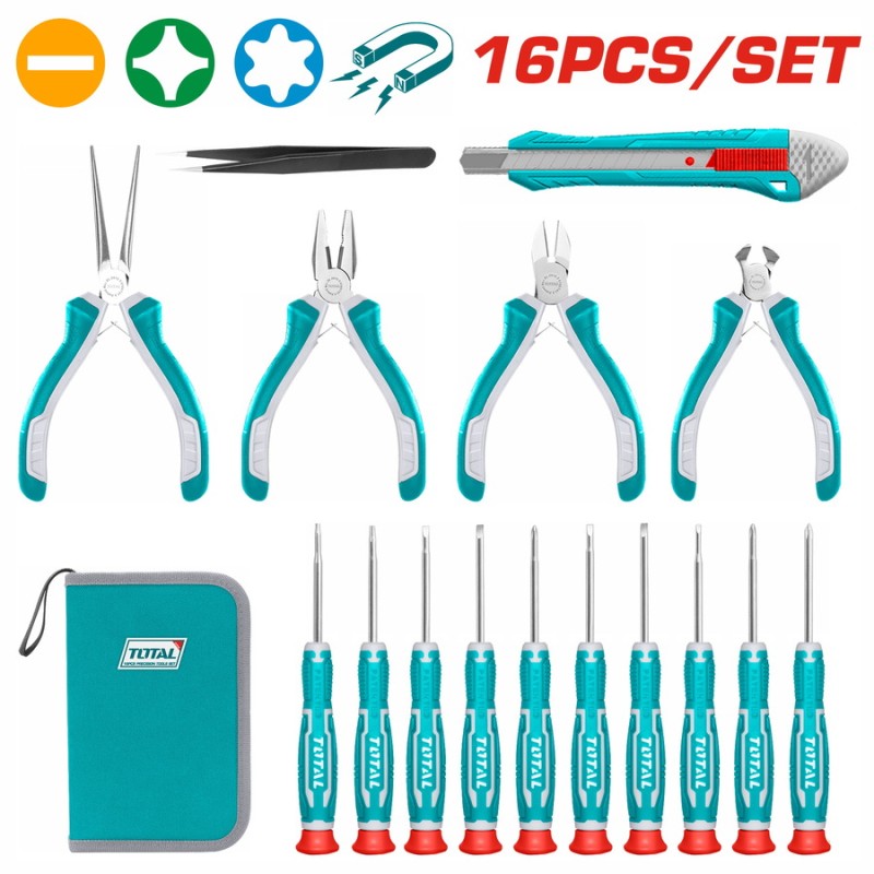| 16 τεμ. Κατσαβίδι ακριβείας Περιλαμβάνει | Πένσα συνδυασμού 1 τμχ 4,5'' Πένσα κοπής διαγώνιας 4,5'' 1 τμχ 1 τεμ 4,5'' Πένσα με μακριά μύτη Πένσα κοπής άκρου 1 τμχ 4,5'' 1 τεμ. τσιμπιδάκια 125mm 10 τμχ Κατσαβίδι ακριβείας| SL1,5*50,SL2,0*50,SL2,5*50,SL3,0*50,PH0*50,PH00*50,PH000*50,T6*50,T8*50, *50 1 τεμ Πλαστικό μαχαίρι που κουμπώνει Καμβά τσάντα Συσκευασία | 20 τεμ