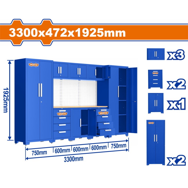 | Μέγεθος προϊόντος | 3300x472x1925mm Πάνω μέρος από μασίφ ξύλο Περιλαμβάνει | 2 τεμ Ντουλάπια με 2 πόρτες Διαστάσεις | 750x472x1925mm 3 τεμ Ντουλάπια τοίχου Διαστάσεις | 600x312x400mm 2 τεμ Ντουλάπια 4 συρταριών Διαστάσεις | 600x410x825mm 1 τεμ Ντουλάπι βάσης με 2 πόρτες Διαστάσεις | 600x410x825mm Πυλώνες 4 τεμ Διαστάσεις | 1450x60x18mm Πίσω πάνελ 3 τεμ Διαστάσεις | 600x670x20mm Πάχος χάλυβα | 0,6~0,8mm Συσκευασμένο σε παλέτα Βάρος | 213 Kg