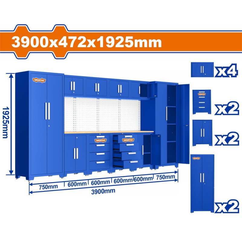 | Μέγεθος προϊόντος | 3900x472x1925mm Πάνω μέρος από μασίφ ξύλο Περιλαμβάνει | 2 τεμ Ντουλάπια με 2 πόρτες Διαστάσεις | 750x472x1925mm Ντουλάπια τοίχου 4 τεμ Διαστάσεις | 600x312x400mm 2 τεμ Ντουλάπια 4 συρταριών Διαστάσεις | 600x410x825mm 2 τεμ Ντουλάπια βάσης με 2 πόρτες Διαστάσεις | 600x410x825mm Πυλώνες 5 τεμ Διαστάσεις | 1450x60x18mm Πίσω πάνελ 4 τεμ Διαστάσεις | 600x670x20mm Πάχος χάλυβα | 0,6~0,8mm Συσκευασμένο σε παλέτα Βάρος | 247 Kg