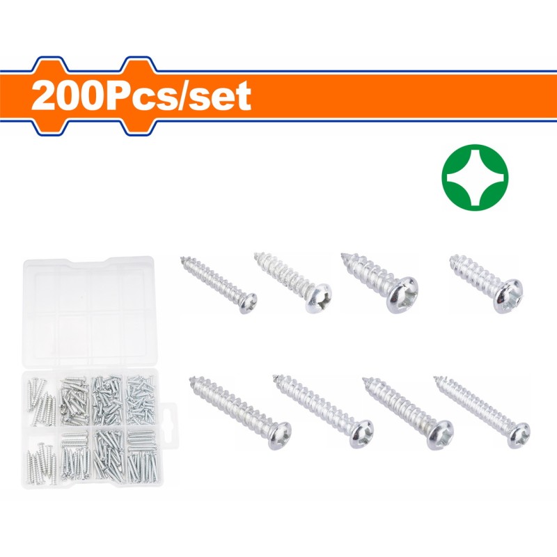 | 200 τμχ / σετ Υλικό | ανθρακούχο χάλυβα Επεξεργασία επιφάνειας γαλβανισμένη Μέγεθος & ποσότητα | 51 τεμ - 3x12mm 30 τεμ - 3,5x25mm 40 τεμ - 3,5x12 mm 30 τεμ - 3,5x19mm 20 τεμ - 4x19mm 15 τεμ - 4x25mm 14 τεμ - 5x30mm Συσκευασμένο σε πλαστικό κουτί Συσκευασία | 40 τεμ