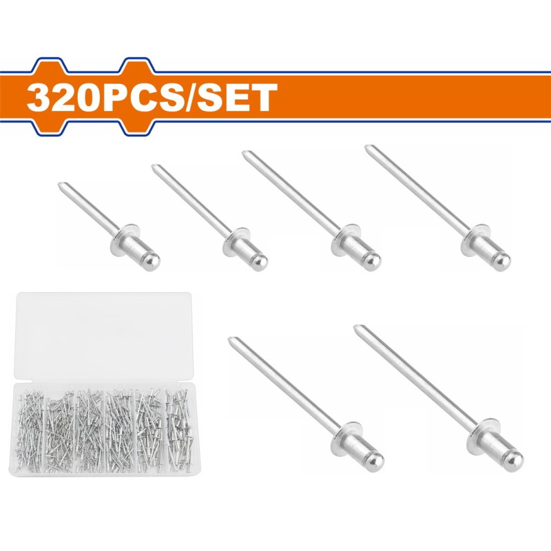 | 320 τεμ/σετ Υλικό | αλουμίνιο & ανθρακούχο χάλυβα Επεξεργασία επιφανειών | ανοδική οξείδωση + γαλβανισμένο Συμπεριλαμβάνει | 80 τεμ 2,4x5,5mm 60 τεμ 3,2x3,2mm 50 τεμ 3,2x6,0mm 60 τεμ 3,2x7,5mm 40 τεμ 4,0x8,0mm 30 τεμ 4,8x8,0mm Συσκευασμένο σε πλαστικό κουτί Βάρος | 360 gr Συσκευασία | 20 κουτάκια